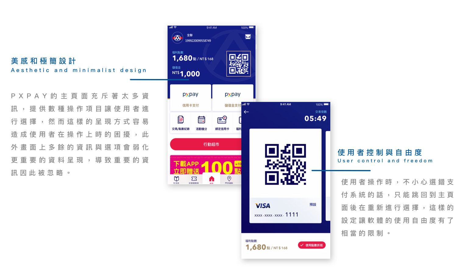 PX Market APP的介面雖然能夠直覺性的進行操作,但使用後發現有許多不順暢的部分,因此決定針對部分常用的功能進行重新設計,找出使用者的痛點或是操作流程上的問題,並提出相對應的設計解方,同時保留官方APP原本所主張的特點,如方便快速、餘額一目了然、快速查帳、資訊優惠一把抓等特徵。希望透過一些改進與調整,讓整體的操作變得更簡潔,提升使用者的體驗。