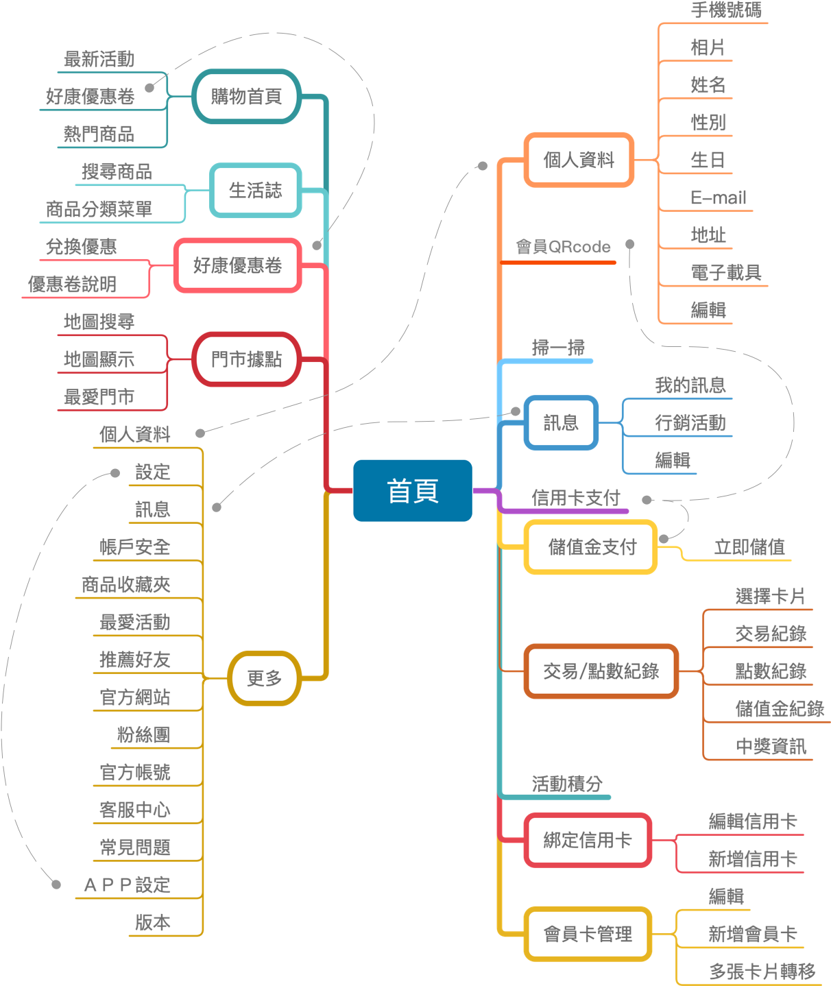 將PX pay app的功能圖(Functional Map) 畫出後,進行介面訊息結構分析。可以發現到有光是主要頁面就充斥了許多資訊與項目,且部分的項目按鈕都會引導到相同的頁面。
